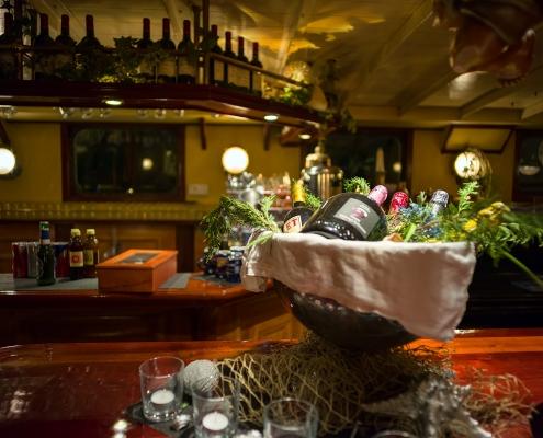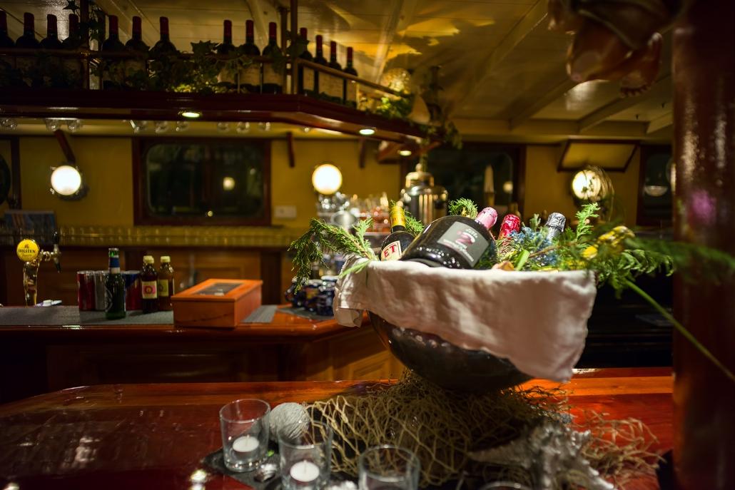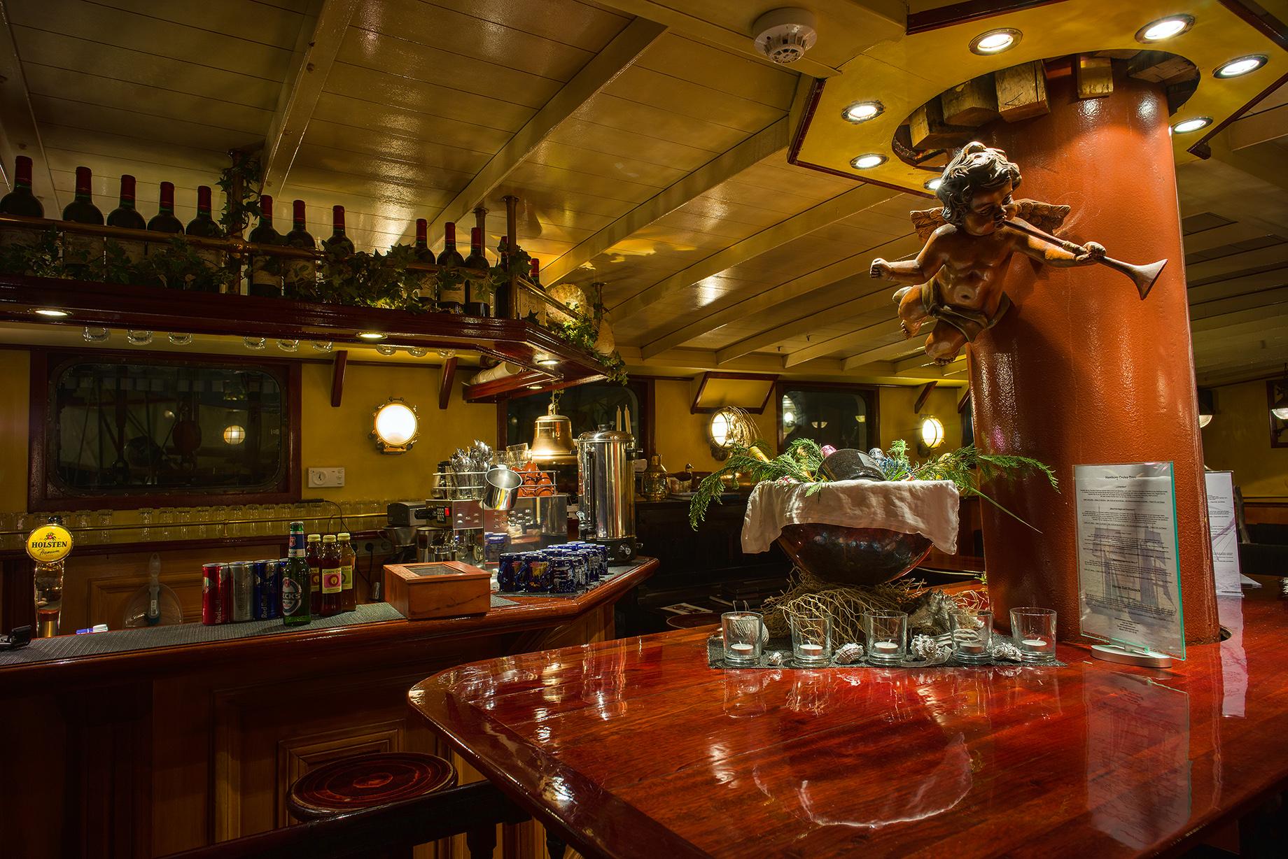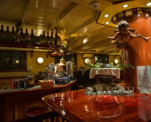 Wer erstmals den Fuß auf die J.R. Tolkien setzt, hat das Gefühl, irgendwie zu Hause angekommen zu sein. Unsere Gäste erwartet ein ebenso geräumiger wie auch behaglicher Salon. Dort finden unsere Gäste genügend Platz für festliche Empfänge, aber auch zum Essen, zum Feiern rauschender Parties oder einfach nur zum Lesen bei einer Tasse Kaffee. Das Ambiente verführt den Besucher durch warme, harmonische Farbtöne, geschmackvoll ergänzt durch edle Holzverkleidungen. In den Salon integriert ist eine stilvolle Bar, die sogar ein Piano beherbergt. Der Salon mit Bar, unser Treffpunkt an Bord.