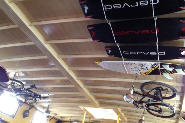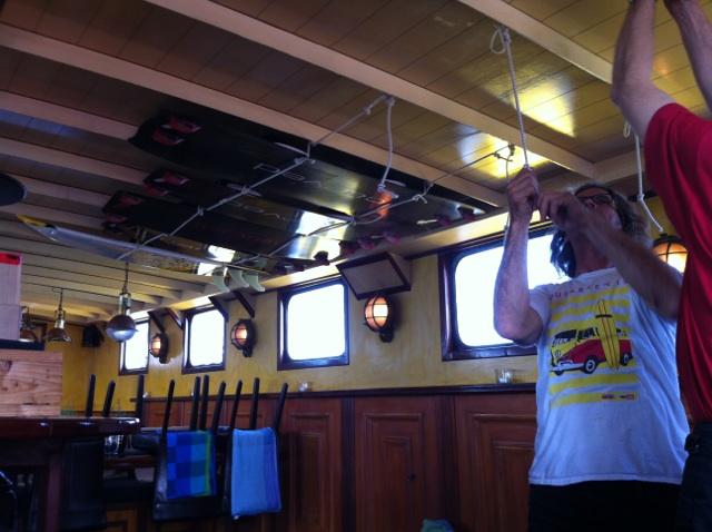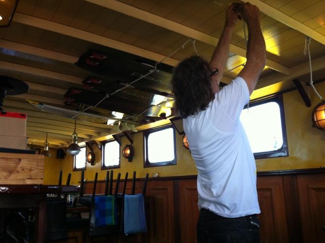 Die boards haben wir sofort an einem guten Platz an der Decke des Salons festgemacht, damit sie während der Überfahrt nach Boulogne nicht rumfliegen.